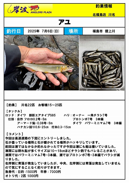 チラシ鉤でもバレることがあり、瀬肩ではパワーミニマム7号-3本錨、瀬ではプロトンボ7号-3本錨でバラシが減りました。