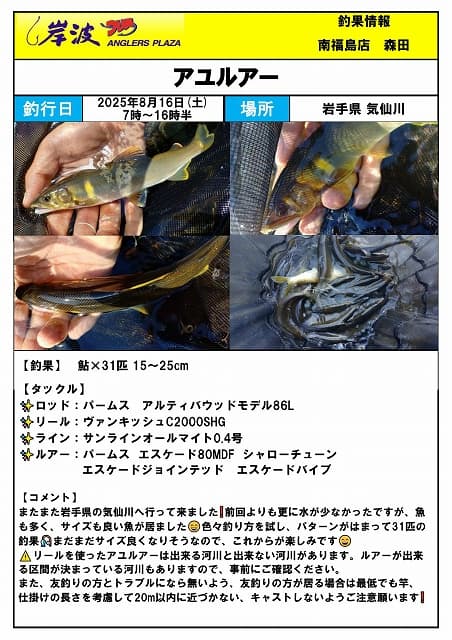 また、友釣りの方とトラブルになら無いよう、友釣りの方が居る場合は最低でも竿、仕掛けの長さを考慮して20m以内に近づかない、キャストしないようご注意願います❗