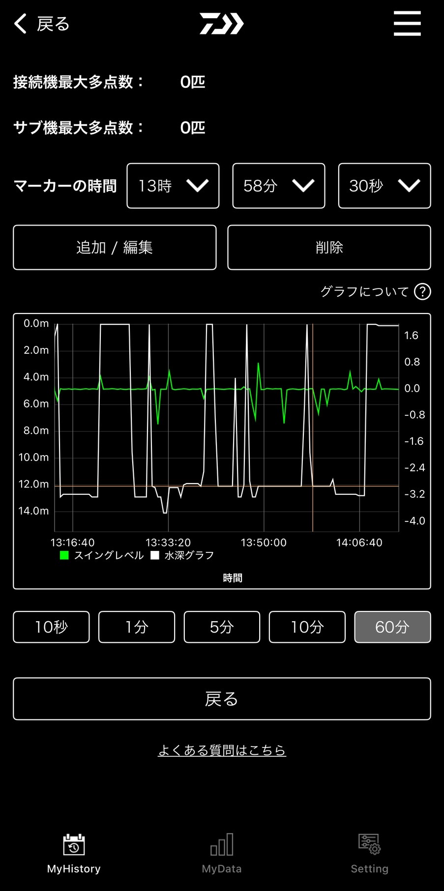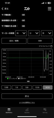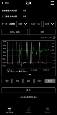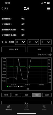 設定の送信はもちろん、秒単位、分単位、時間単位でデータが取れるので釣り終わった後の検証も興味深い部分がたくさん有りました。 前評判以上の機能があると思います。