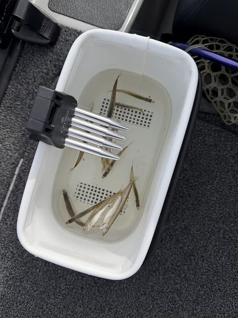 前日の強風によりワカサギの群れがわからずワカサギの群れを探すところから始まりました。すぐに反応が出てきてコンスタントに釣れ始まりました。ただ、外道が多くワカサギがかかると外道に変わり仕掛けがダメになることも。 外道が多く仕掛けは多めにあると良いと思います。