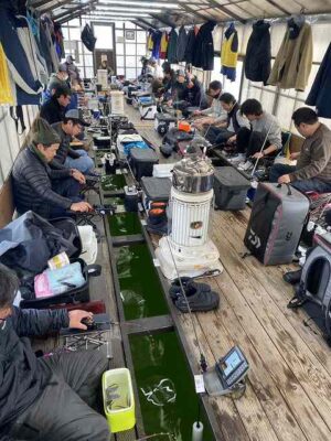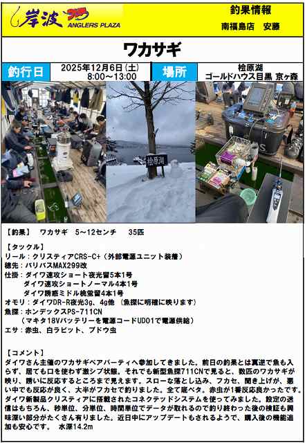 ダイワさん主催のワカサギペアパーティへ参加してきました。 前日の釣果とは真逆で魚も入らず、居ても口を使わず激シブ状態。 それでも新型魚探711CN で見ると、数匹のワカサギが映り、誘いに反応するところまで見えます。 スローな落とし込み、フカセ、聞き上げが、悪い中でも反応が良く、大半がフカセで釣りました。 全て底ベタ。 赤虫が1 番反応良かったです。