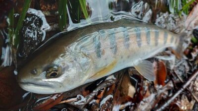 前日の雨と雪代の影響で増水😩流れが緩い場所や石が点在する浅い場所を狙って無事魚をキャッチ❗️